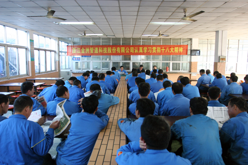 11月19日中午,管道工業(yè)黨支部召開黨員干部會議,黨支部書記鄭榮與公司黨員干部一起認(rèn)真研讀黨的十八大報告、黨章,對十八大報告中提出“五位一體”、“八個堅持”、“兩個百年目標(biāo)”等亮點進(jìn)行了深入解讀和貫宣。鄭榮強(qiáng)調(diào)指出,學(xué)習(xí)十八大精神關(guān)鍵在于結(jié)合實際、狠抓落實,要營造學(xué)習(xí)宣傳貫徹十八大精神的濃厚氛圍,不斷激發(fā)廣大黨員干部和員工貫徹落實十八大精神的熱情,以更加求真務(wù)實的作風(fēng),有力地推動企業(yè)健康穩(wěn)定發(fā)展。管道工業(yè)黨支部還發(fā)動各車間、各部門開展學(xué)習(xí)活動,進(jìn)一步宣傳貫徹黨的十八大精神,將黨的十八大的理論與精髓帶到基層,傳達(dá)給每一位員工。