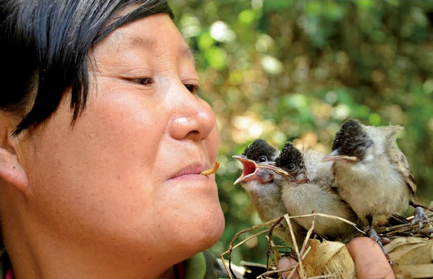 “鳥媽”李學書用嘴叼蟲喂食幼鳥